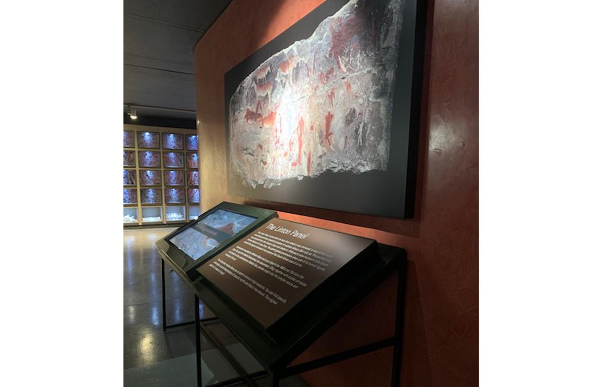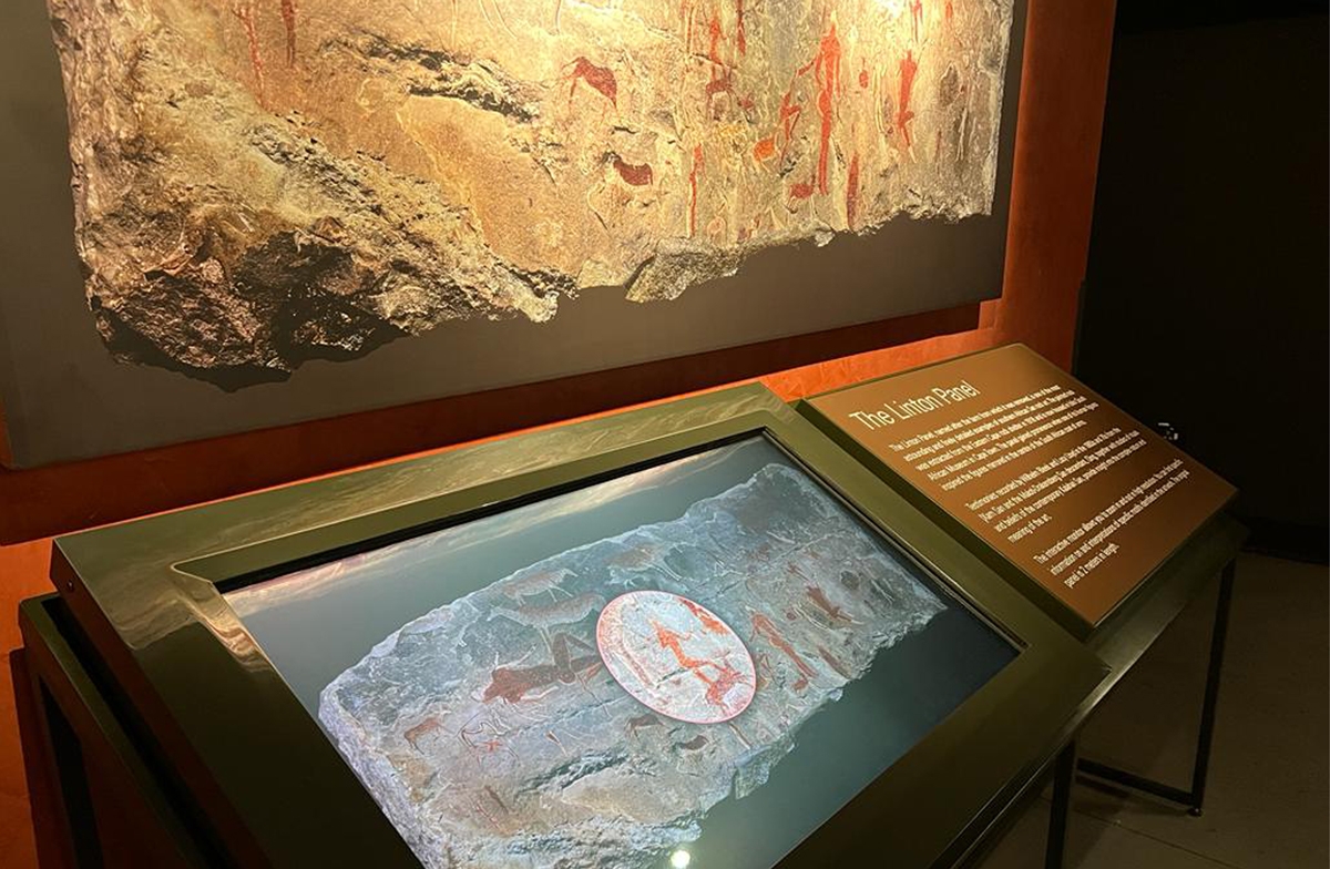 This art was painted by ancestors of the San who once lived in the eastern Cape. The Coat of Arms thus references the indigenous peoples of South Africa and the intricacy and complexity of the ancient art, and draws on its power to unite. The exhibit has an interactive monitor that allows visitors to explore and magnify the details of the Linton panel.