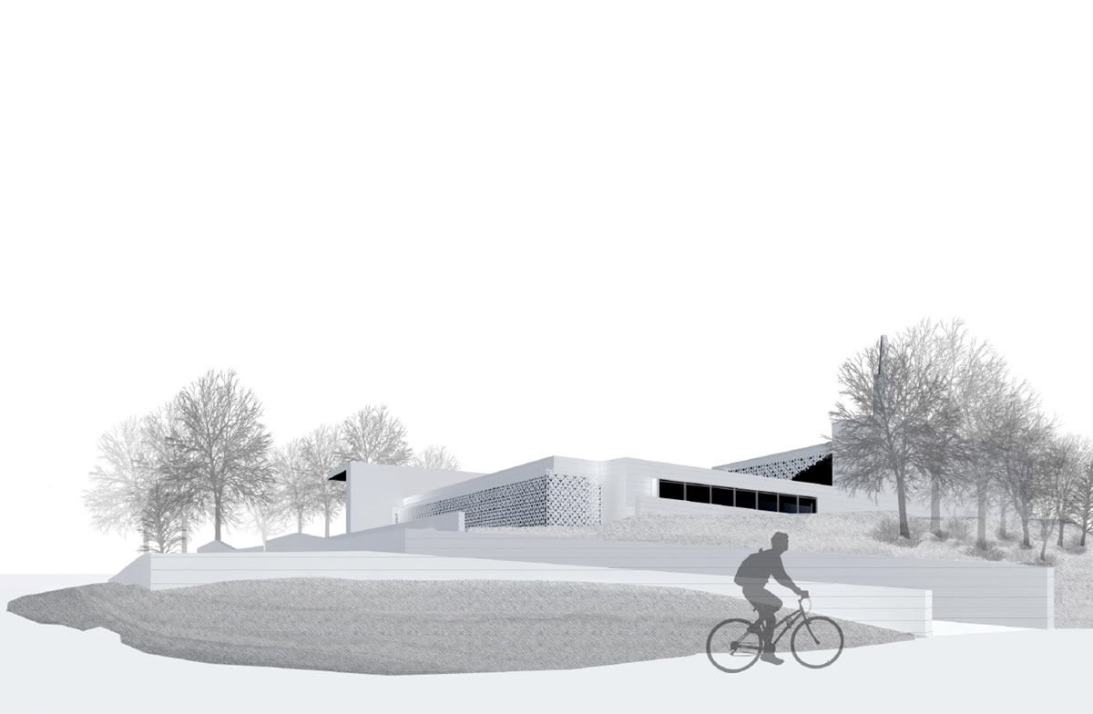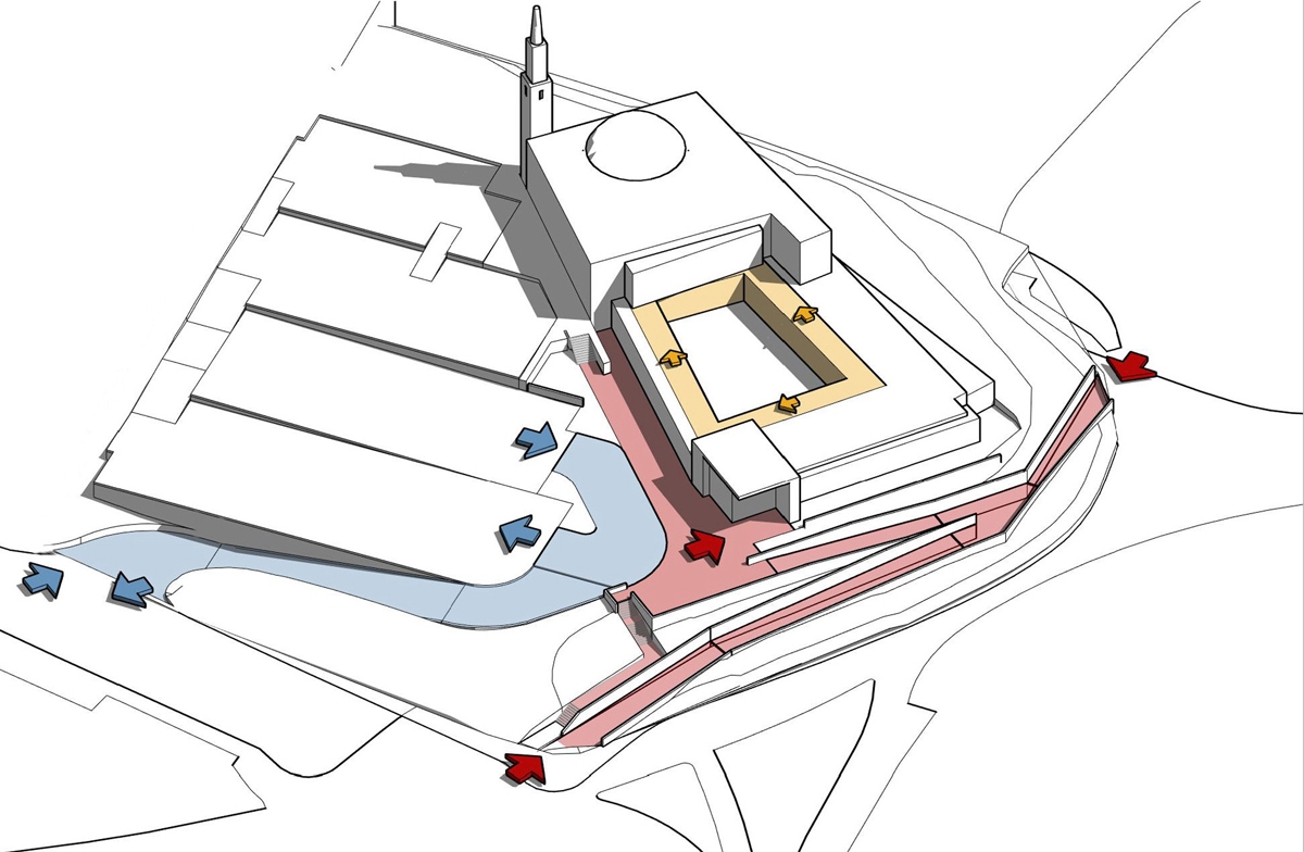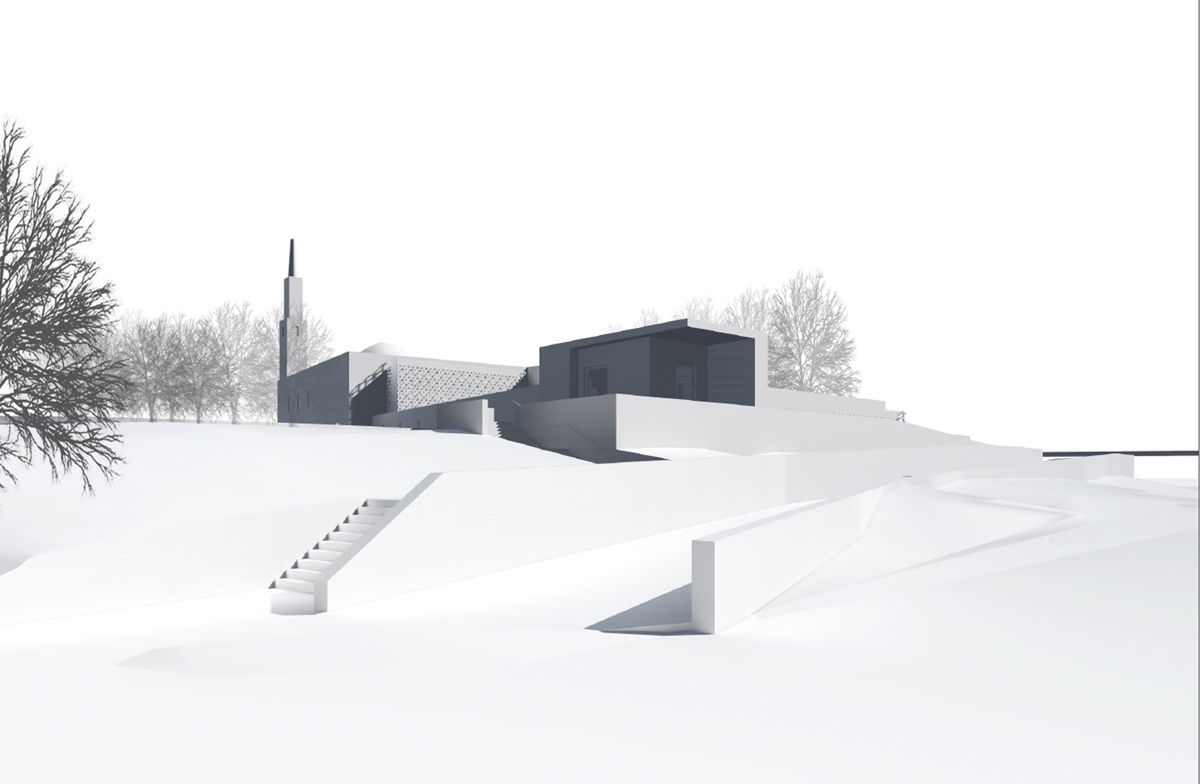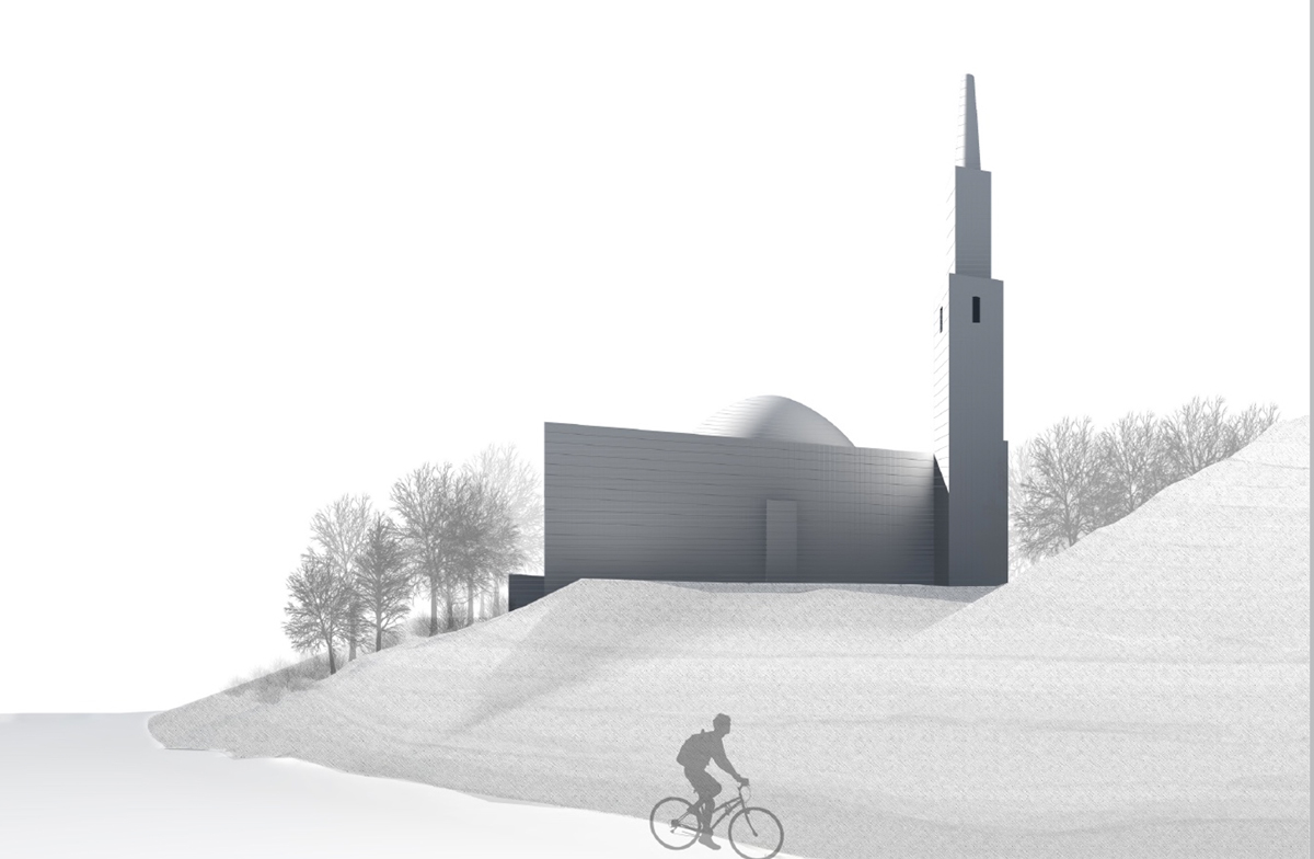 Islamic forms are referenced through the silhouette of dome, minaret, and the void of the courtyard. The massing of the building is partially submerged. The articulation of landscape and approach, build incrementally from the approach ramp to the pinnacle of the minaret. Historically the inner sanctum of the mosque is about a connect to the Kaaba and a spiritual alignment that is about disconnecting from the city. The inner chamber responds to Mecca while the external shape is a splayed gesture of open arms – a call to inclusivity.