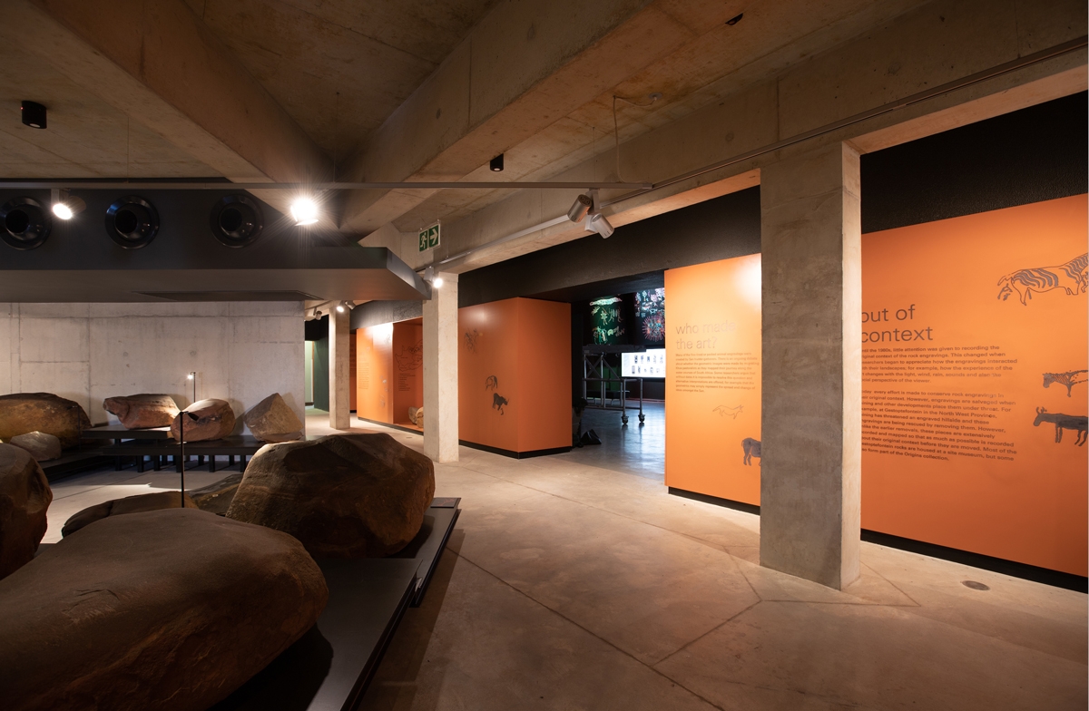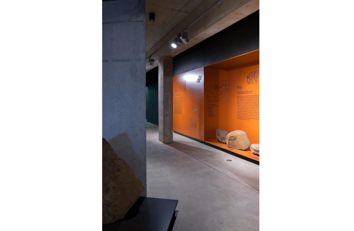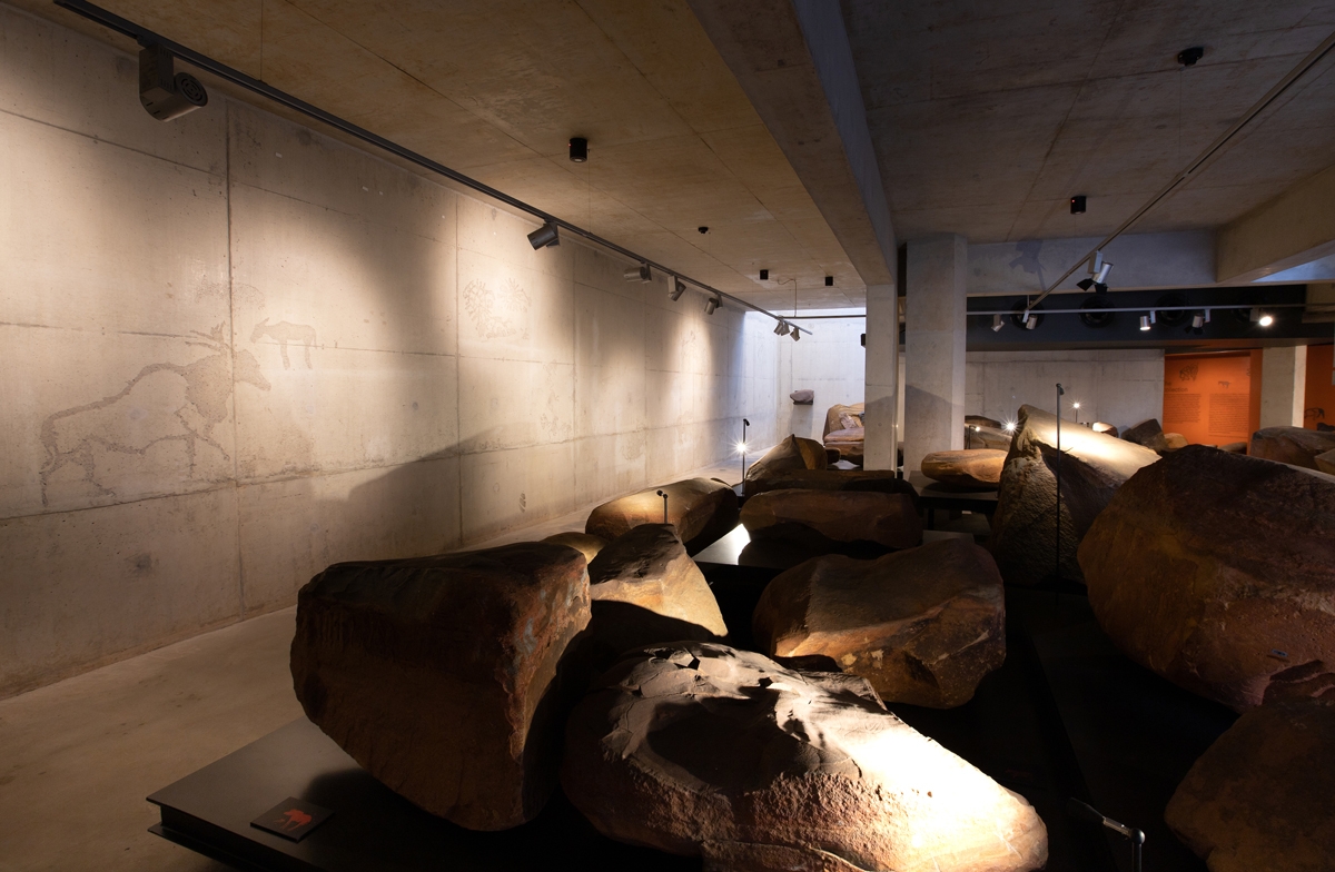 The exhibit offers the bulk of this important rock engraving collection as a resource for visitors to engage. The plinths are largely kept away from the concrete walls to create constructed ‘landscape’ islands. The rocks are organized with an archival sensibility onto floating steel platforms of varying heights and cantilever. Each rock has a label that displays the archival reference number and has a tracing of the engraving to allow visitors to identify the often feint images. The exhibit holds the collection as an open archive, allowing visitors and scholars to interpret the engravings beyond a fixed curated experience or anthropological narrative. The correlation of the artifact and the exhibit language helps to highlight the nuance and specificity of the collection.